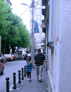 Yesterday, after our sleepless night, we ventured to the Belgrade zoo.  Our apartment is located about two miles from the zoo and in an effort to drain every last bit of energy out of our little hummingbird, we walked there.  Along the way, we came across many interesting sights, but only one screamed to be used as a backdrop for our daughter.  Although we are making a constant effort to give her praise and love and positive reinforcement, she has been spending a fair share of her time in ‘timeout’.